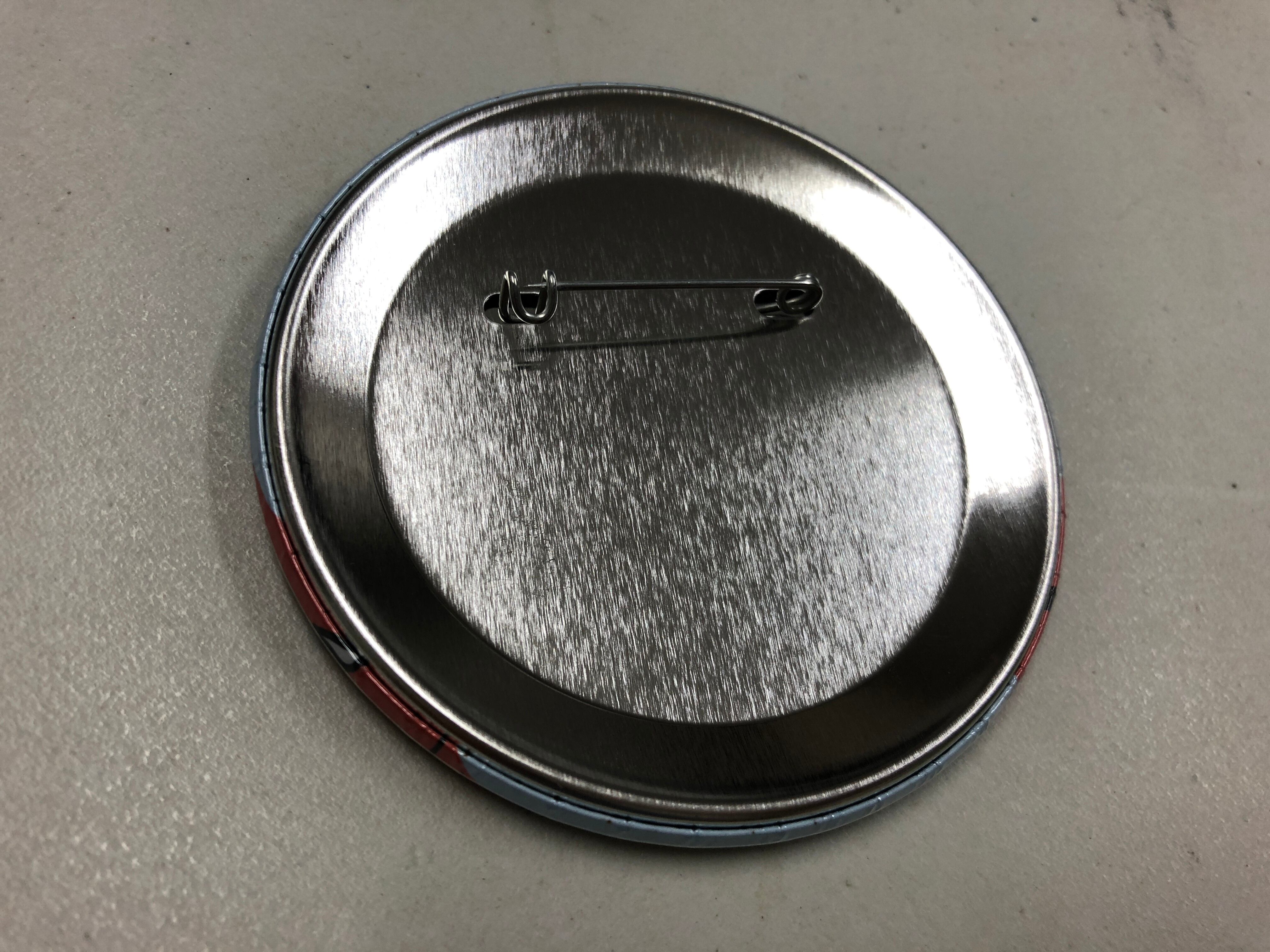 75mmの、ピンタイプのバッジです。取れやすい場合はピンの上からセロテープで固定してご利用ください。
